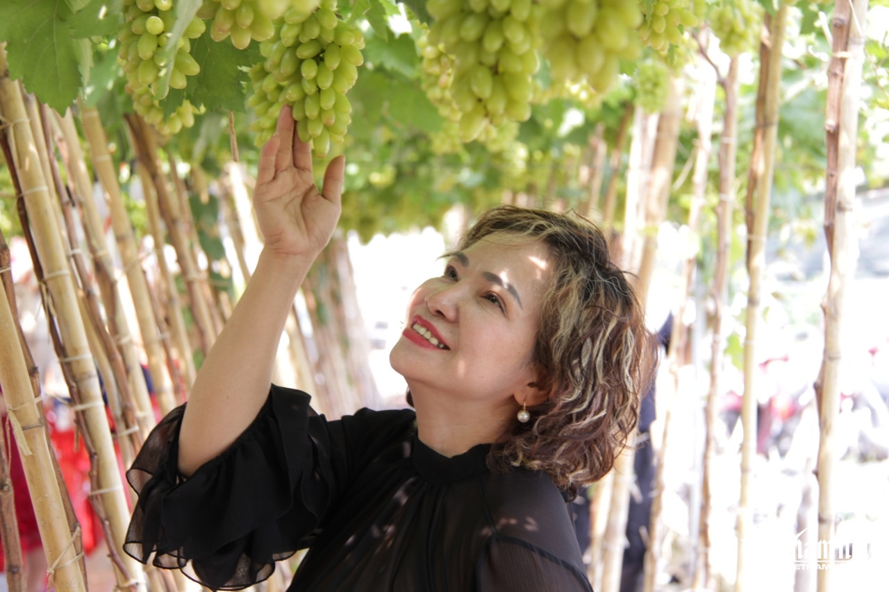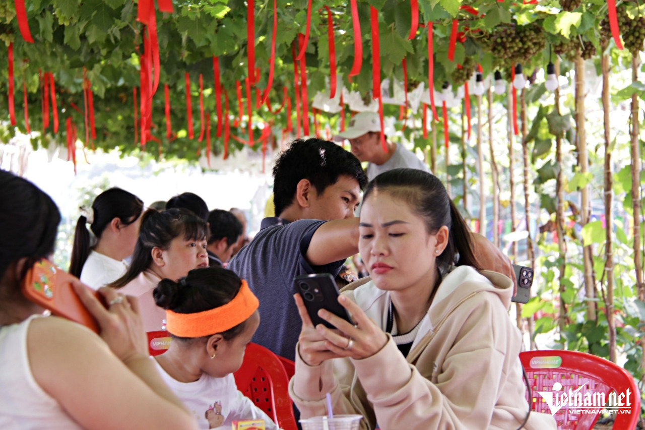 Chị Bình bất ngờ, thích thú với không gian xanh mát và liên tục chụp ảnh cùng những chùm nho lúc lỉu tại quán nước. Ảnh: Hà Nguyễn