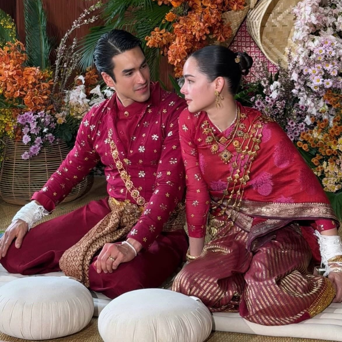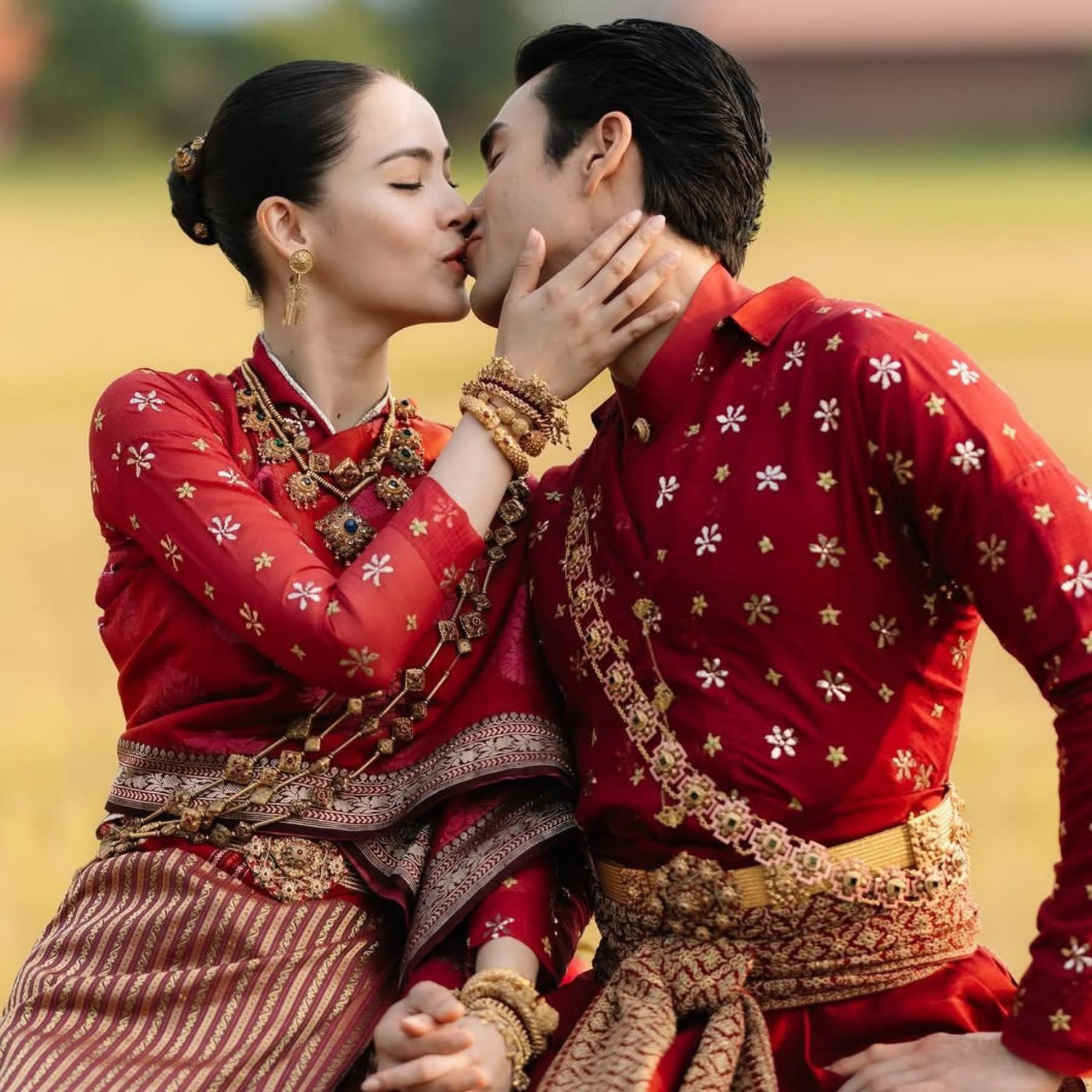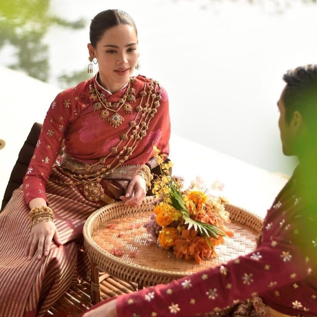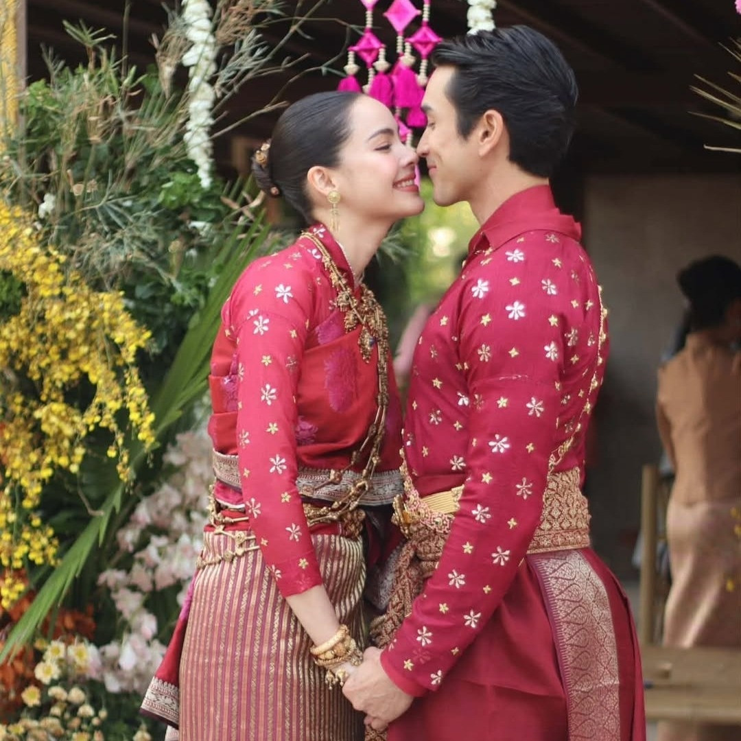 Buổi lễ được tổ chức theo nghi thức truyền thống vùng Isan, mang không khí gần gũi. Cặp đôi diện trang phục vải truyền thống với sắc đỏ rực rỡ, nổi bật nhờ họa tiết tinh xảo.