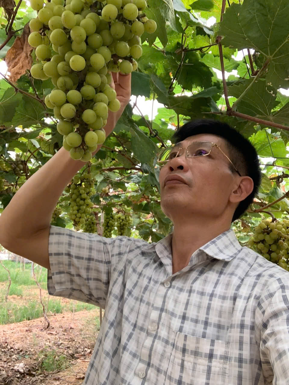 Anh Giáp Văn Nhân, Giám đốc HTX nông nghiệp và PTNT công nghệ cao Huyền Trang bên vườn nho sữa