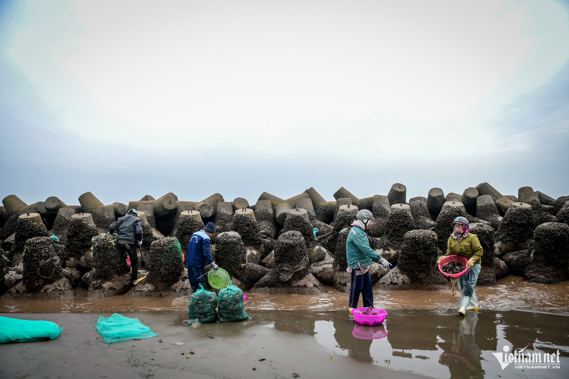Sau một buổi chiều liên tục lội dưới nước lạnh để bắt con vẹm nhỏ tại bãi biển xã Giao Ninh (tỉnh Ninh Bình), nhiều người dân có thể kiếm được từ vài trăm nghìn đến cả tr...