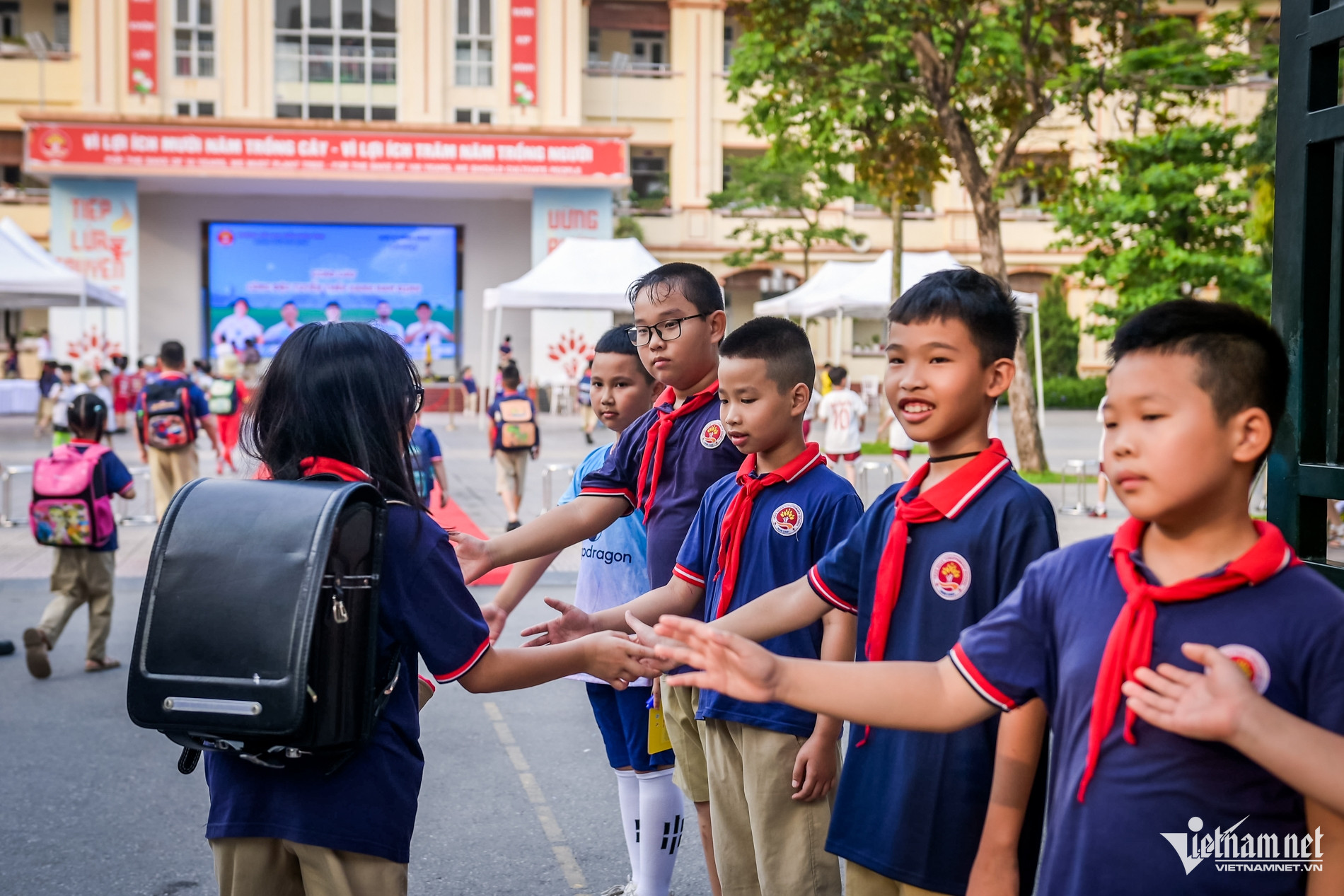 Học sinh Trường Tiểu học Trần Nhân Tông đón các bạn khi lớp mình làm nhiệm vụ trực tuần.