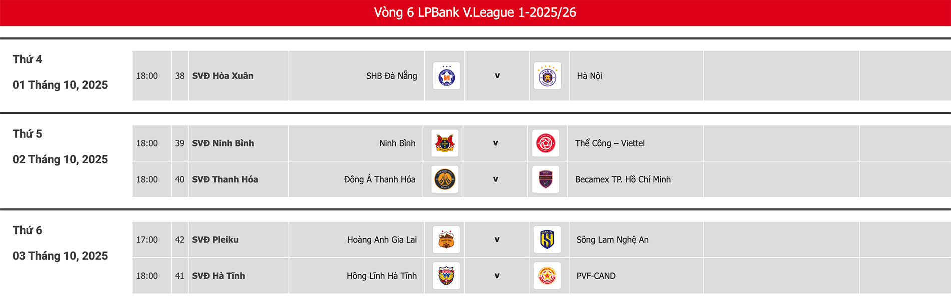 Lịch thi đấu vòng 6 LPBank V-League