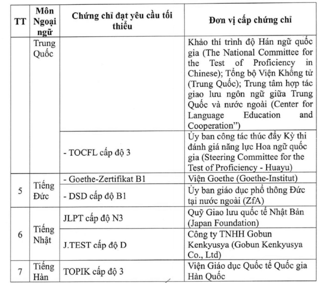 Cụ thể, ngoài chứng chỉ ngoại ngữ được miễn thi giống năm trước, điểm mới đáng chú ý là Bộ GD-ĐT bổ sung thêm 2 loại chứng chỉ ngoại ngữ là tiếng Nhật, tiếng Hàn (J.TEST, TOPIK, VEPT) ở năm 2026.