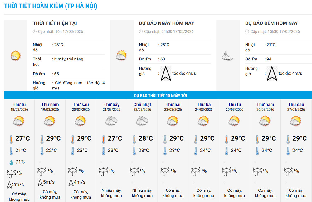 Từ đêm 20-21/3, thành phố có thể có mưa nhỏ rải rác, nhiệt độ dao động 22-26 độ. Những ngày sau đó, thời tiết Hà Nội ít biến động, phổ biến nhiều mây, đêm và sáng có sương mù nhẹ rải rác, trưa chiều trời nắng. Nhiệt độ thấp nhất 22-23 độ, cao nhất 28-29 độ.