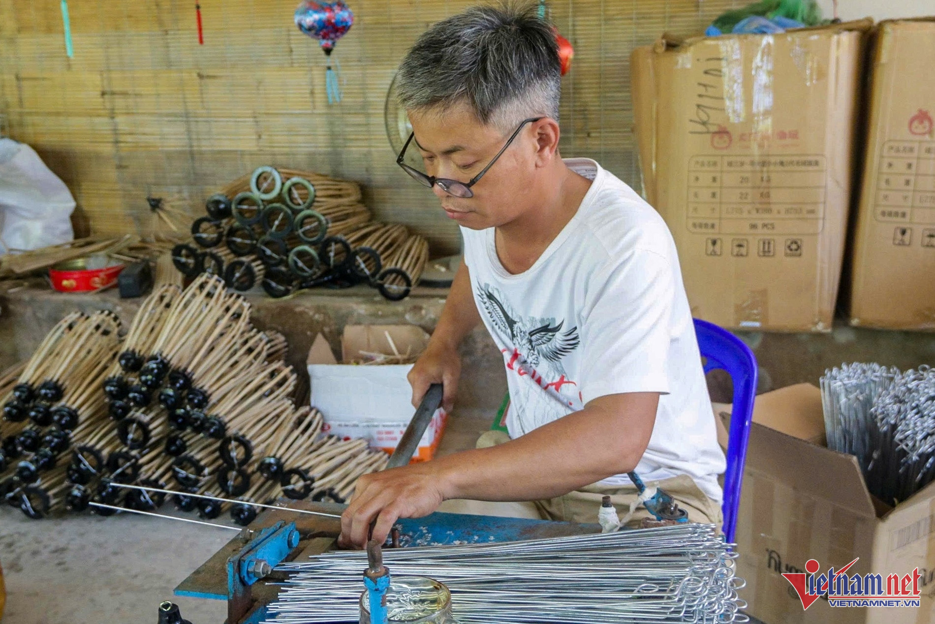 Người thợ thủ công uốn dây thép làm khung giữ cho đèn lồng chắc chắn