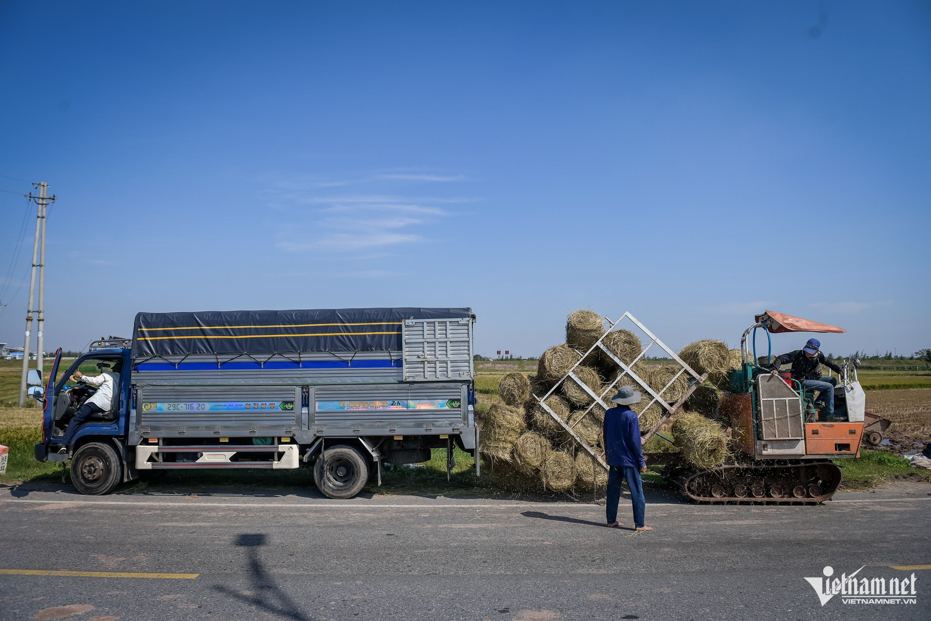 Anh Điện bốc rơm xếp lên xe tải cho thương lái.