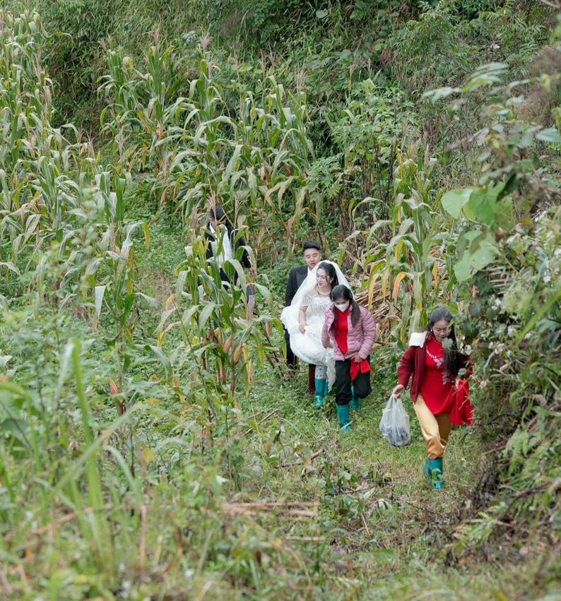 Theo hình ảnh trong video, màn rước dâu chỉ có 5 người bao gồm cả cô dâu, chú rể. Cặp nhân vật chính và người thân phải đi ủng, vượt qua đoạn đường gian nan, khi thì trèo núi, khi thì lội ruộng để đưa cô dâu về nhà chồng.