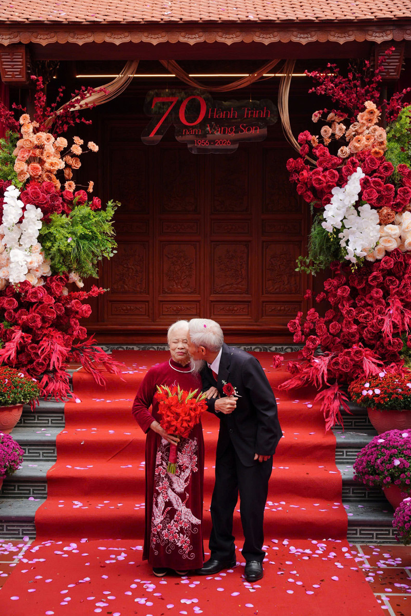Không gian buổi lễ được trang hoàng rực rỡ với hoa tươi, dải lụa mang tông đỏ chủ đạo. Trong ngày đặc biệt, cụ bà diện áo dài cưới, cụ ông mặc vest chỉnh tề, nắm tay vợ bước đi giữa tiếng vỗ tay chúc mừng của con cháu. Bó hoa lay ơn đã được cụ ông trao cho vợ trong phần nghi thức sau đó.