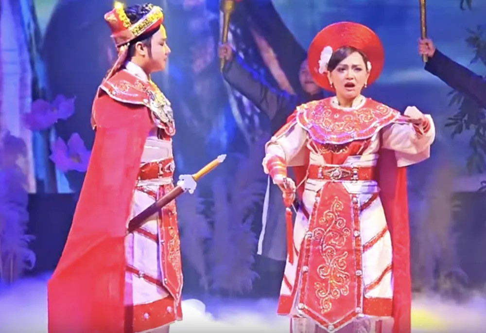 Cụ thể, Bùm Bum thể hiện nhân vật Trưng Trắc trong Tiếng trống Mê Linh - vở diễn từng ghi dấu ấn của NSƯT Thanh Nga cùng loạt tên tuổi gạo cội.
