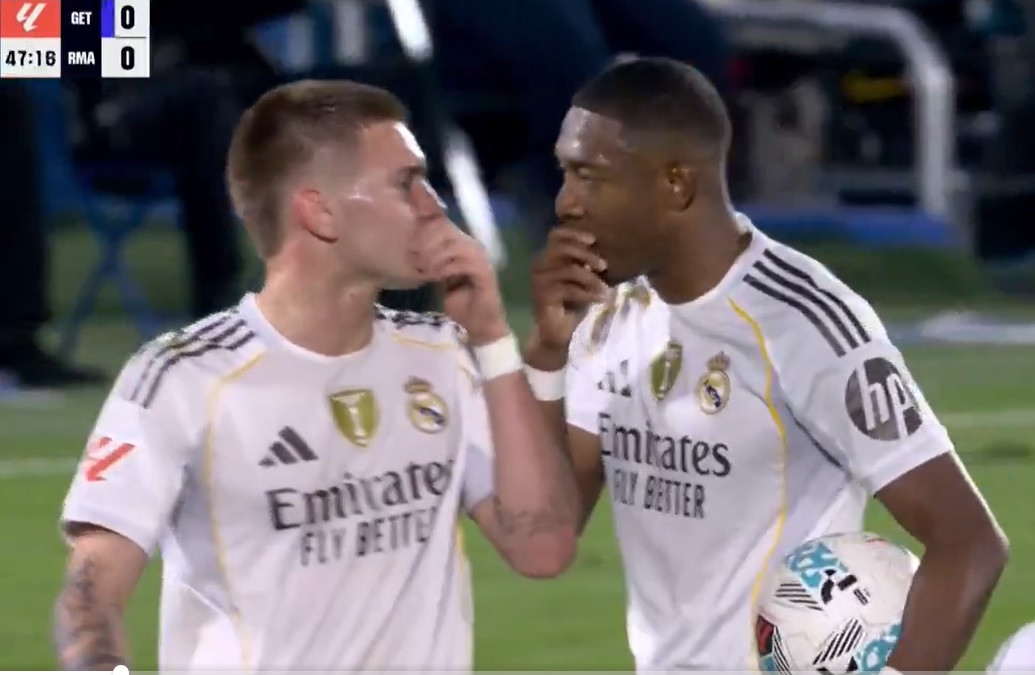 Đó là khoảnh khắc đội bóng áo trắng được hưởng một quả phạt trực tiếp ở đầu hiệp 2. Mastantuono muốn thực hiện, nhưng David Alaba đã cầm bóng nhận trách nhiệm.