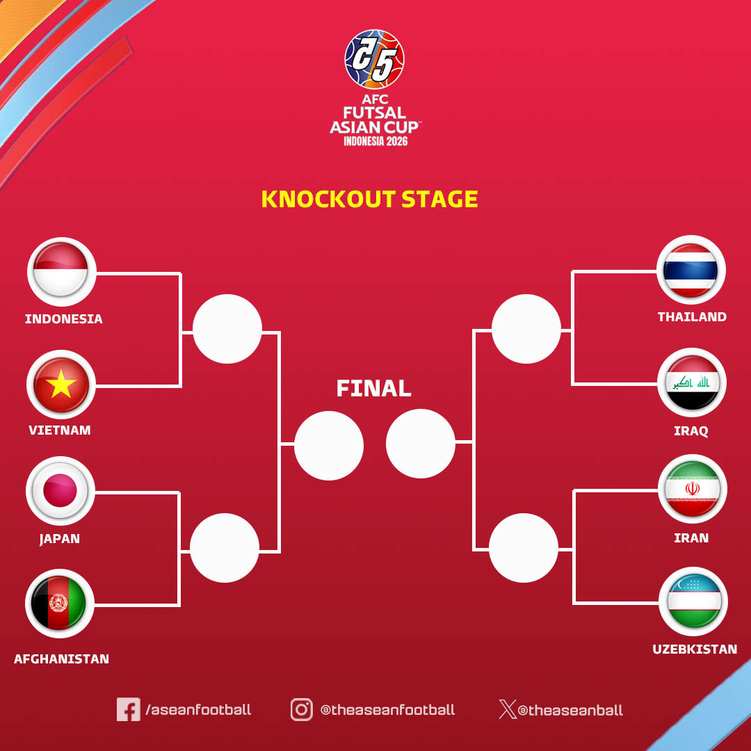 Bốn cặp tứ kết sẽ diễn ra ngày 3/2, đáng chú ý nhất là màn so tài giữa Indonesia và tuyển futsal Việt Nam lúc 19h.