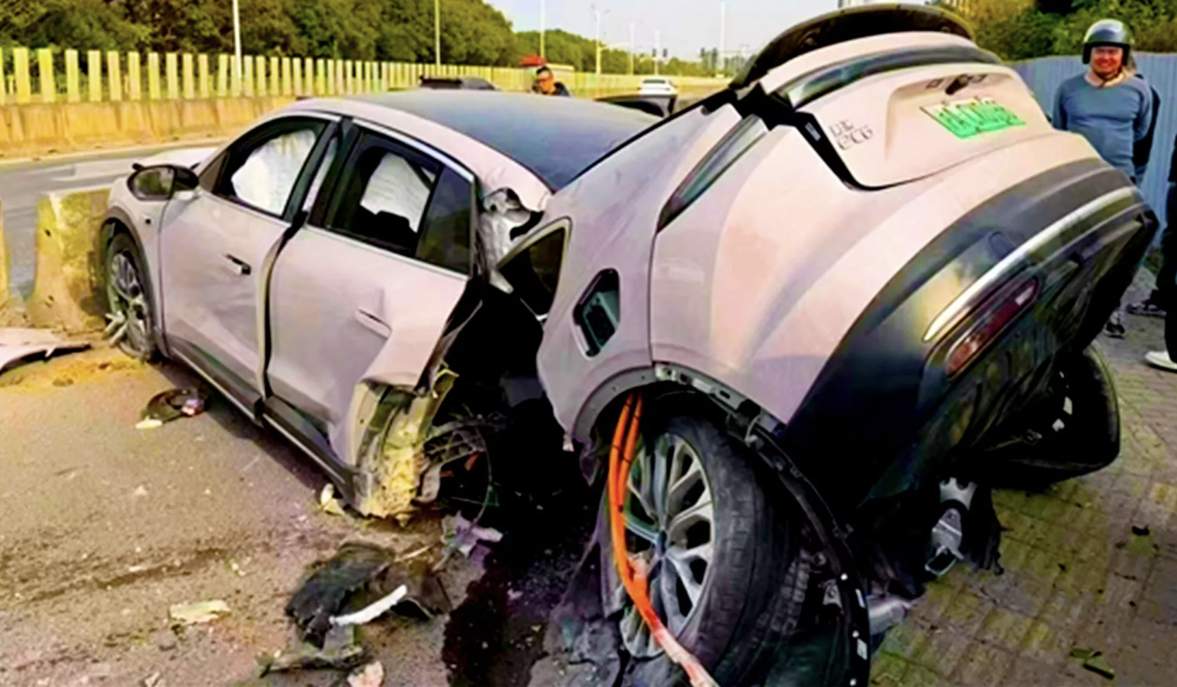 Dù chiếc xe gần như “tách đôi”, tài xế và hành khách không bị thương. Quan trọng hơn, bộ pin không bị hư hại nghiêm trọng và hoàn toàn không xảy ra cháy nổ, điều thường gây lo ngại với xe điện khi gặp tai nạn.