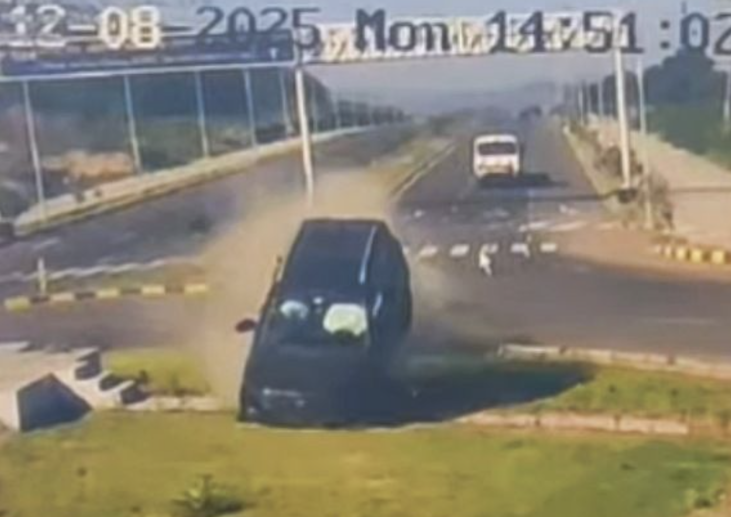Chiếc SUV bất ngờ lao qua một gờ giảm tốc lớn và bật lên không trung. Phía trước là vòng xuyến có đường kính lớn nên xe đâm mạnh vào mép vòng, kích hoạt cả hai túi khí phía trước. Sau cú va chạm, chiếc xe tiếp tục xoay trên vòng xuyến, phần bánh sau hẫng khỏi mặt đường rồi dừng lại.