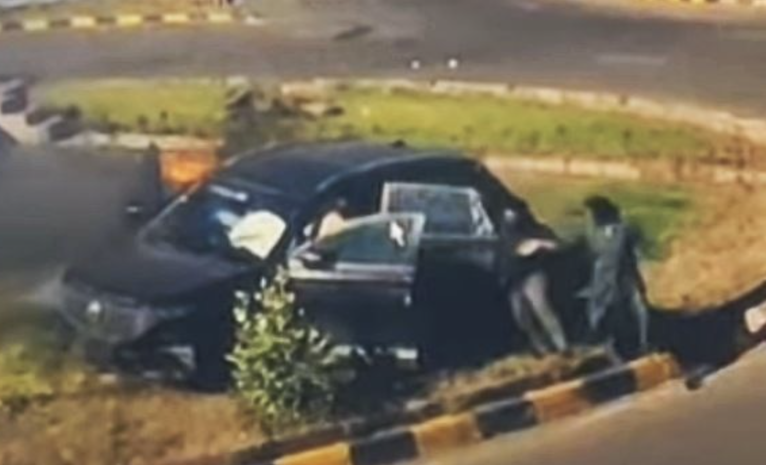 Một người đàn ông từ ghế sau bên phải nhảy xuống, chạy vòng sang phía trái để kéo hai phụ nữ ra ngoài. Anh này sau đó quay lại mở cửa ghế trước bên phải để hỗ trợ tài xế. Một số người khác cũng thoát khỏi xe và cố gắng lấy lại hành lý trước khi chiếc SUV bị thiêu rụi hoàn toàn.